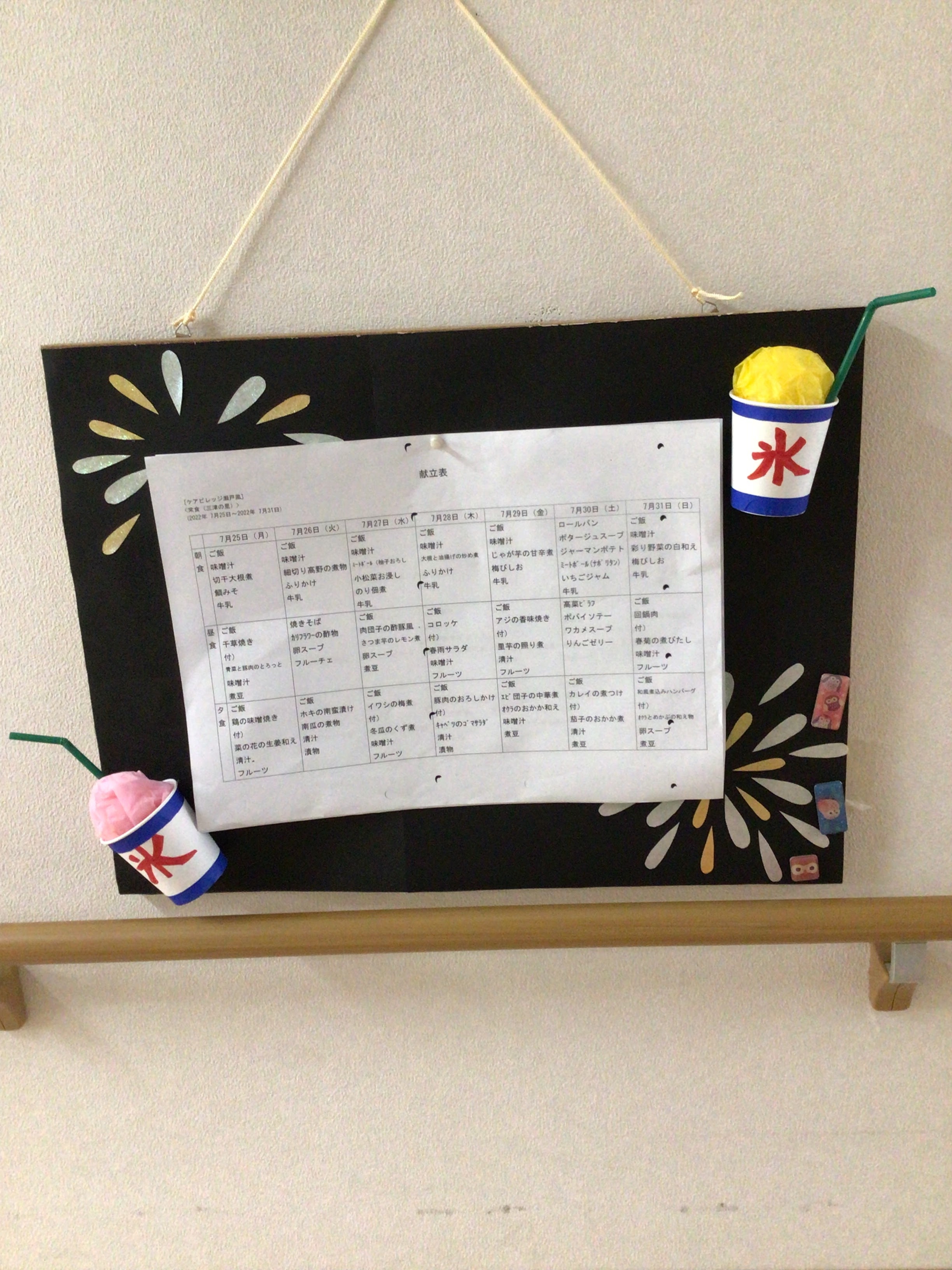 メニュー表だけだと味気ないですが、職員が可愛らしく季節感を感じる飾り付け等で工夫をしてくれています😄😄